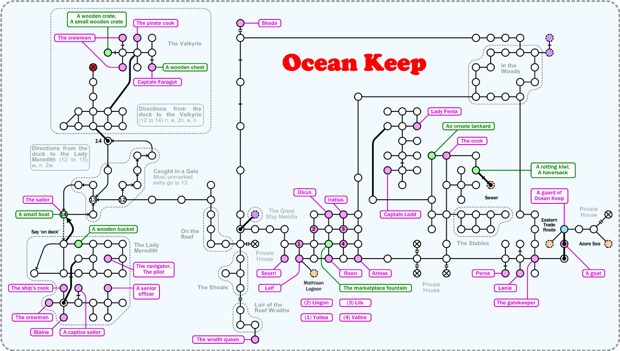 The city of Ocean Keep used to border the Ocean of Storms, a sea whose waves were in perpetual furor and whose skies were always dark. Ruled by the Lord and Lady Willem, the city was, and is, a thriving seaport where justice and peace rule. However, tales of pirates under the leadership of a man named Faragut have been running wild, and it seems there is more to the 'peace' in Ocean Keep than meets the eye. Luckily for Ocean Keep, it did not become landlocked by the Shattering, as some of the small coastal villages along the Ocean of Storms have. It now sits on the Azure Sea. The Lord and Lady Willem hope to make Ocean Keep a prime port in this new age of sea travel.