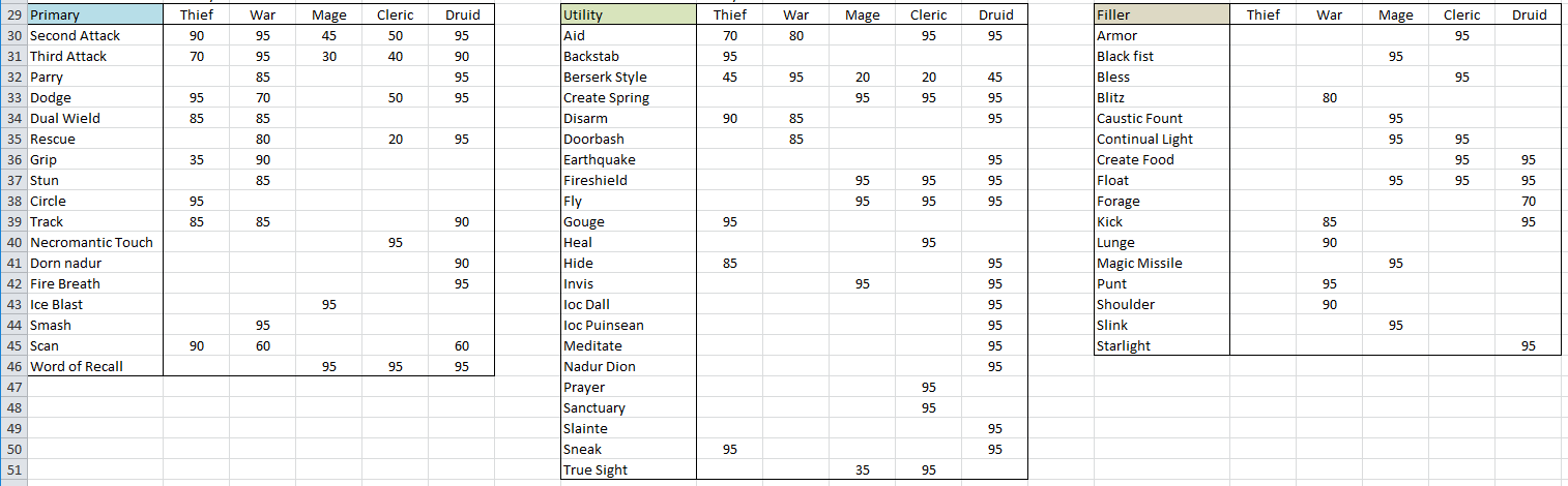 - If both classes have a skill, at different levels, and different %'s, it should be lowest level, highest adept percent.