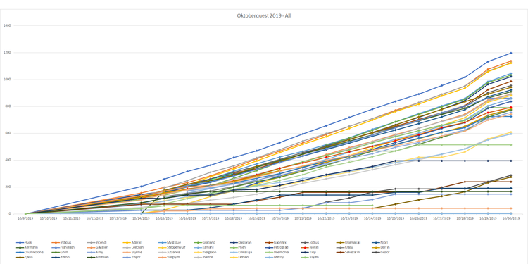 ( 2) Zistrosk 10/10/19 Oktoberquest Games --- Max daily points per game in the Beerhaus: --- 5 - King's Treasure Key 6 - Beer Barrel Keg Tapping 10 - Barrel Challenge 10 - Schuhplattler (dance) Contest (note: more socials will be added) 25 - Defeat the Bavarian Barbarian 5 - SECRET CHALLENGE (so mind bogglingly hard, you'll never figure it out!) --- 61 - max per day - So that is: 61*21 days +1 freebie point = 1282 max possible score. - Zat is all from Zist --------------------------------------