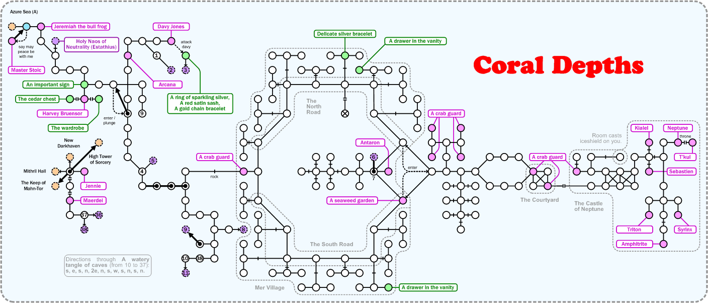 Following the Darkhaven River eastward, many an adventurer has come upon a vast area of glistening water and waves. A casual swim is enjoyed here, though one must be wary of fish and aggressive sharks. It is beneath the lapping waves where the wonders, and dangers, of the Coral Depths truly lurk. The fabled Merfolk have founded a paradise under the sea, pushing back all manners of danger from their wondrous village. Some of the most wise and intelligent scholars of Despair reside in Mer Village, teaching the cherished young. The Merfolk have one common enemy beneath the waves: a sea hag who resides in the deepest corner of the dark coral tunnels. Little is known about this hag, yet it is suspected that she is preparing one day to destroy the Merfolk completely...