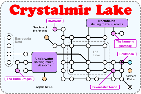 Nestled in the Foothills in the southernmost tip of the Northern Plains, a sign marks the entrance to a quiet valley. Here lies a crystal lake surrounded by a ring of mountains. Locals call this lake Crystalmir and legend has it that a large turtle dwells deep beneath its waters. The valley is rumored to be inhabited by small bands of hobgoblins and a few farmers who attempt to grow crops there. In the mountains where the wild horse roams, some say there lies a secret passage into the vast forest of mazes.