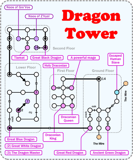 As the ages pass, the eternal struggle between the dragons of Despair and the inhabitants of the Realms begins to swing into the favor of the ones without wings. Eventually, the weaker members of the draconian race slowly began to die out and were forced to retreat. The draconian, a breed of half-dragon humanoids, were led by their king through the southern swamps. After a long journey through a maze of marshy forests, the king declared a dry section of land, nestled between two hillocks, as the new draconian home. Using human slaves and the help of five dragons, a large tower was erected to honour the draconian race. Over time, the whispers of the grandeur of the Dragon Tower reached the Dragon Queen Tiamat. Weary of the waging of war, Tiamat decided to claim the top of the tower as her own. Waiting for all of her wounds to heal, Tiamat simmers in rage for the days of the dragons to return...
