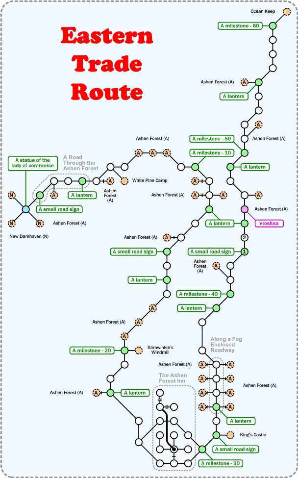 Connecting from the city of New Darkhaven out to Ocean Keep in the Azure Sea, the Eastern Trade Route was built by the various merchants and crafts guilds to provide a safe and secure route through the Ashen Forest. Along the road, there is an inn for weary travelers and also a stable where one can can purchase a mount for faster travel. A small fund is donated yearly to maintain the road for all who wish to use