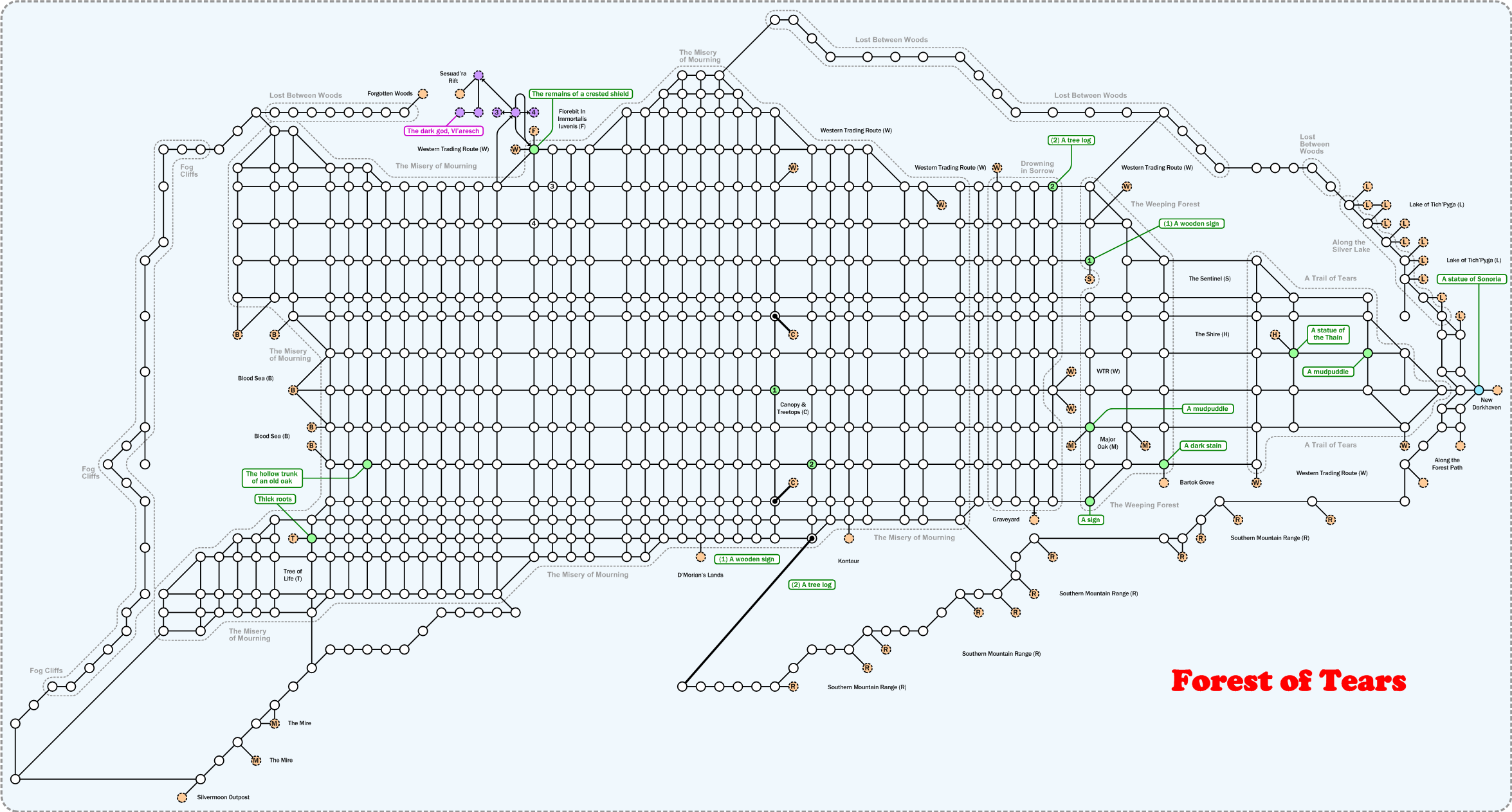 A thick wedge of dark leafy trees separate the Forgotten Woods from the daunting peaks of the Southern Mounts and the perils of the marshes and swamps. Laying west of Darkhaven, it is the quickest route from the City of Light to the Blood Sea. Following the Shattering, some of the Realms' more timid races, including the gnomes and halflings have taken shelter among the thick green leaves of these somber woods.