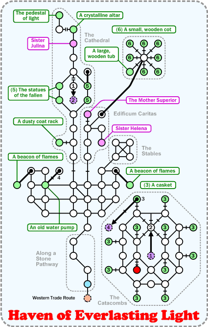 Within sight of the western most city of light lies the resting place for many who died in the last battle before the Shattering. A great tomb was constructed, by order of Duke Luther, so that those who died could be buried in a style befitting their service to the Realm. Upon the site of this tomb, a branch of the Sisters of Light were charged with the duty of overseeing its protection and upkeep. To this end they built a cathedral devoted to the Light they worshiped, and to those that fell in battle to preserve it. It's been rumoured, however, that the rationale for entombing the remains of the fallen was less than noble. Some claim that many of the dead rose up after the Shattering, cursed in the last moments of their life by the deity slayer named Pseulak. Strange tales have surfaced regarding trapped caskets and hidden tombs, where the dead have arisen from their sleep. Whether it be a folktale, as most believe, or the twisted truth, the Haven of Everlasting Light is a memorial to a time long past, but not forgotten.