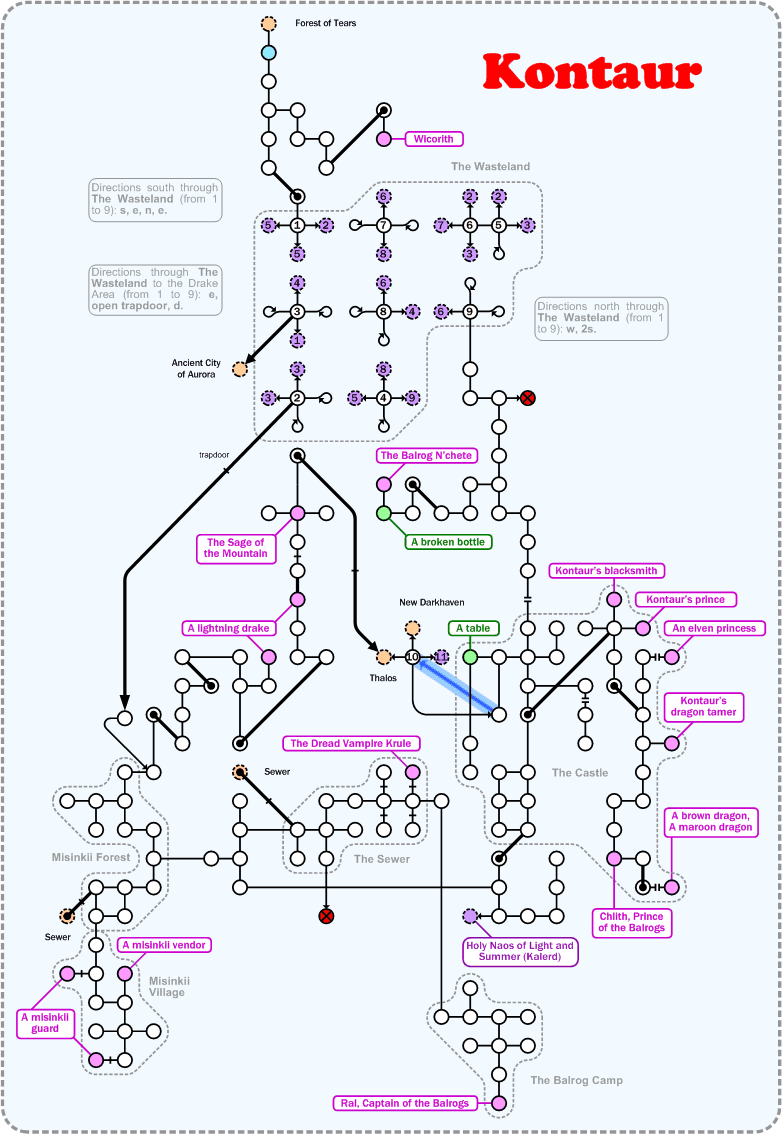 Kontaur can be a pretty dangerous place, but it's full of pretty cool eq and some nice Realms history. Aggro guards wander the castle and the balrog camp (and there's similar mobs called beastmen in the forest). The trickiest part is Carnifex castle, which is entirely no recall. Kontaur is also home to Wicorith, the simplest way to get to The Underworld. Aside from the stuff in Carnifex, the only run mob of real note is Sage of the Mountain. Chlith has some decent stuff that is easy to get too.