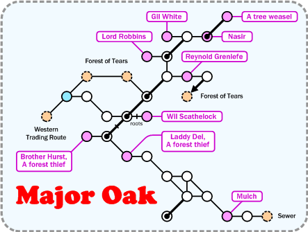 Cities, ever growing and prospering attract the attention of merchants,consumers, traders and their money. In an effort to get a good deal for their merchandise, merchants travel from city to city, selling where they can find good demand. Likewise, the consumers that can afford to, travel in search of good prices. The cities themselves are often well guarded for the protection of their citizens, guests and visitors. The trade routes between the trading centers become the ideal place for thieves to wait in ambush for these migrating sources of wealth. Major Oak, a very large, hollow tree in the Forest of Tears, is one of these great ambush locations. Overlooking the Western Trade Route, the enormous oak is home to a well known, admired and feared band of outlaws that always manage to stay slightly out of the clutches of the city's guards while being everywhere that a wealthy merchant might be counting his coins. Rumours state that the tree is built on tunnels with secret exits leading to many ambushes as well as escape routes.