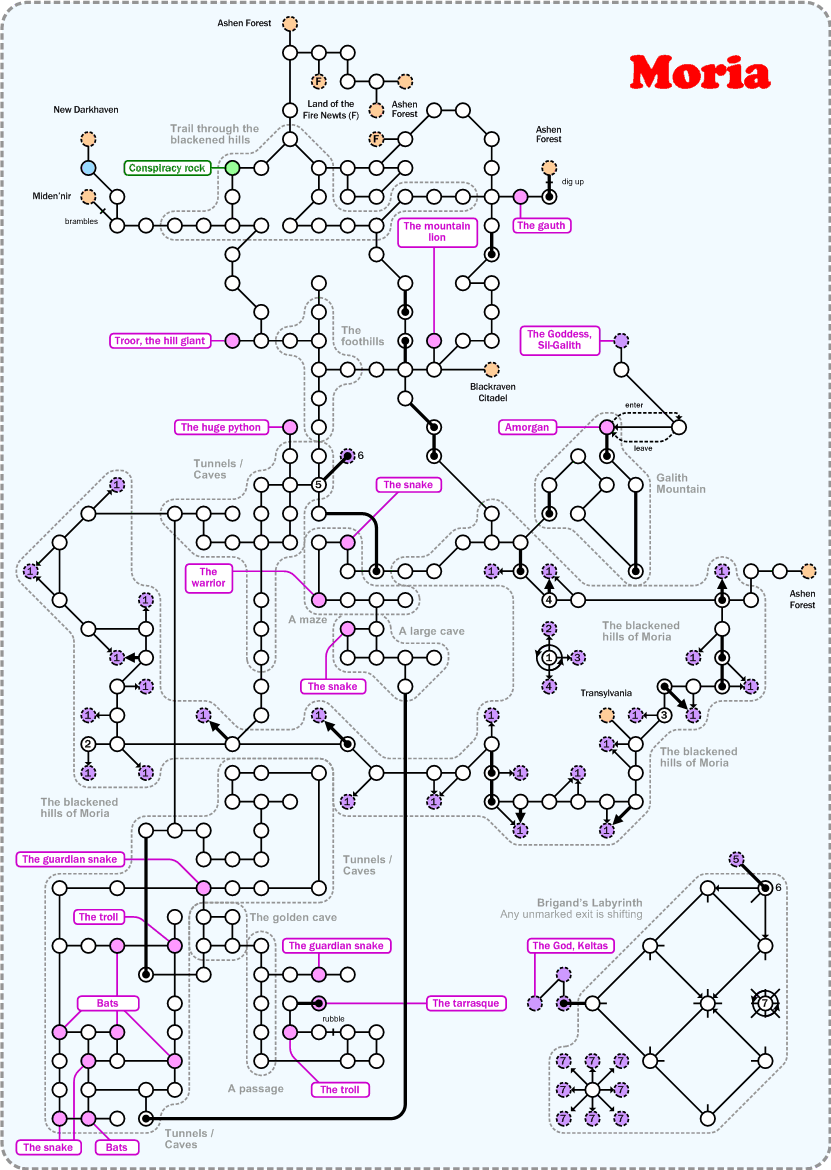 Wandering the barren landscape south of the Cross Roads on the Hilltop, the black foreboding of obsidian hills compels investigation. Moria's twisting tunnels and caverns house dozens of vile races who seem engaged in a perpetual war to conquer this dark realm.
