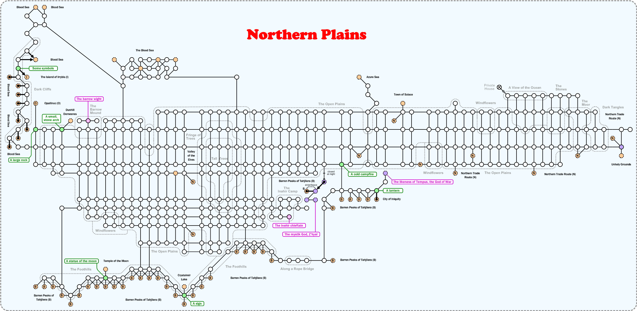 The northern shores wait forever, their bone-white beaches combed by frigid waves, the shore slowly faltering as the grasses take hold. The plains stretch south, wide sweeping grasslands, broken by copses and strange circles of standing stones. The eltor roam the plains, grazing on the sweet grasses, hunted by the Inahir. Rumors abound that the Inahir will only respect those who can hunt these powerful animals. These peaceful people live quietly beneath the shadow of the barren peaks, far from the sea.