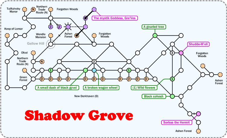 The Shadow Grove is located just north of the city of New Darkhaven. The rolling hills are covered in tall grass, perfect for any grazing animal, yet few are found there. The local citizens of Darkhaven shy away from the grove as well and some say that is has been cursed by The Unknown.
