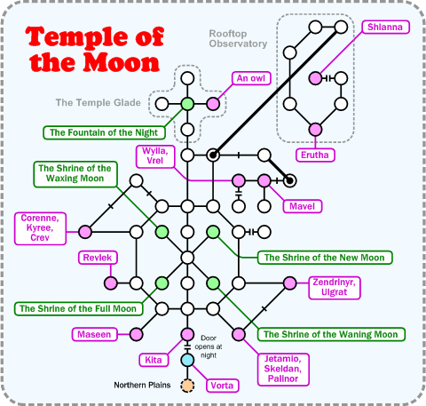 In the Northern Plains lies a Temple dedicated to the eternal and everchanging phases of the Moon. Rebuilt over the ashes of an older temple, the Priestfolk there spend their days seeking ways to aid their fellow man...through learning, healing, and charity. They gladly accept fellow worshippers, or anybody who is interested in their Goddess and her teachings.