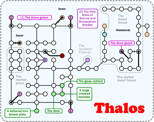 Thalos was once the most powerful nation in Realms, a constant thorn in the side of Darkness, an ever-vigilant defender of Light. It was not surprising then that, after another victory against Lord Seth's forces, a magical black mist was unleashed on the city. Any who entered the foul mist were dead within minutes, poisoned by the deadly vapors. When the dark cloud lifted, Thalos was left in ruins, its once slavebound lamias now deadly creatures. A beholder was left to rule over the wreckage. None have attempted to rebuild Thalos, for they say it is cursed for all time...