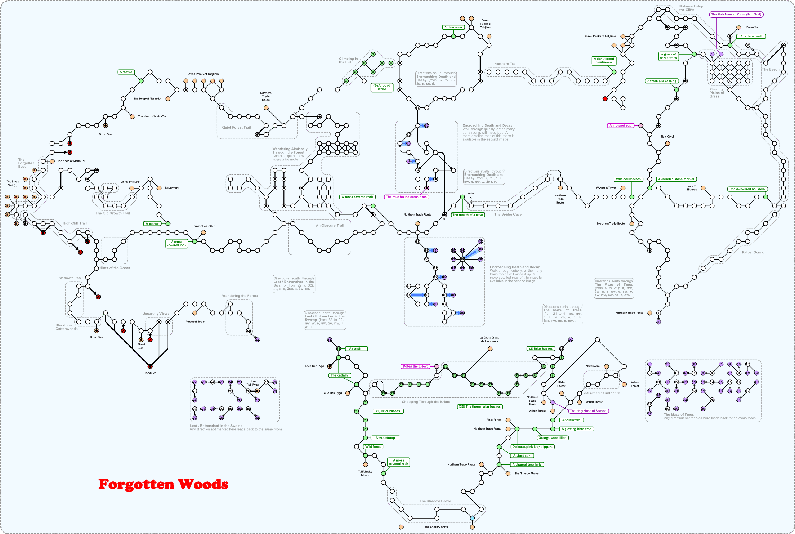 The Forgotten Woods stretch west from the Blood Sea to the shores of the Azure Sea. Sitting just north of Darkhaven, the Forgotten Woods divide the continent in half. The Barren Peaks of Tahjliera border the northern edge of the woods, while the southern edges gradually blend into the Ashen Forest and the Forest of Tears.