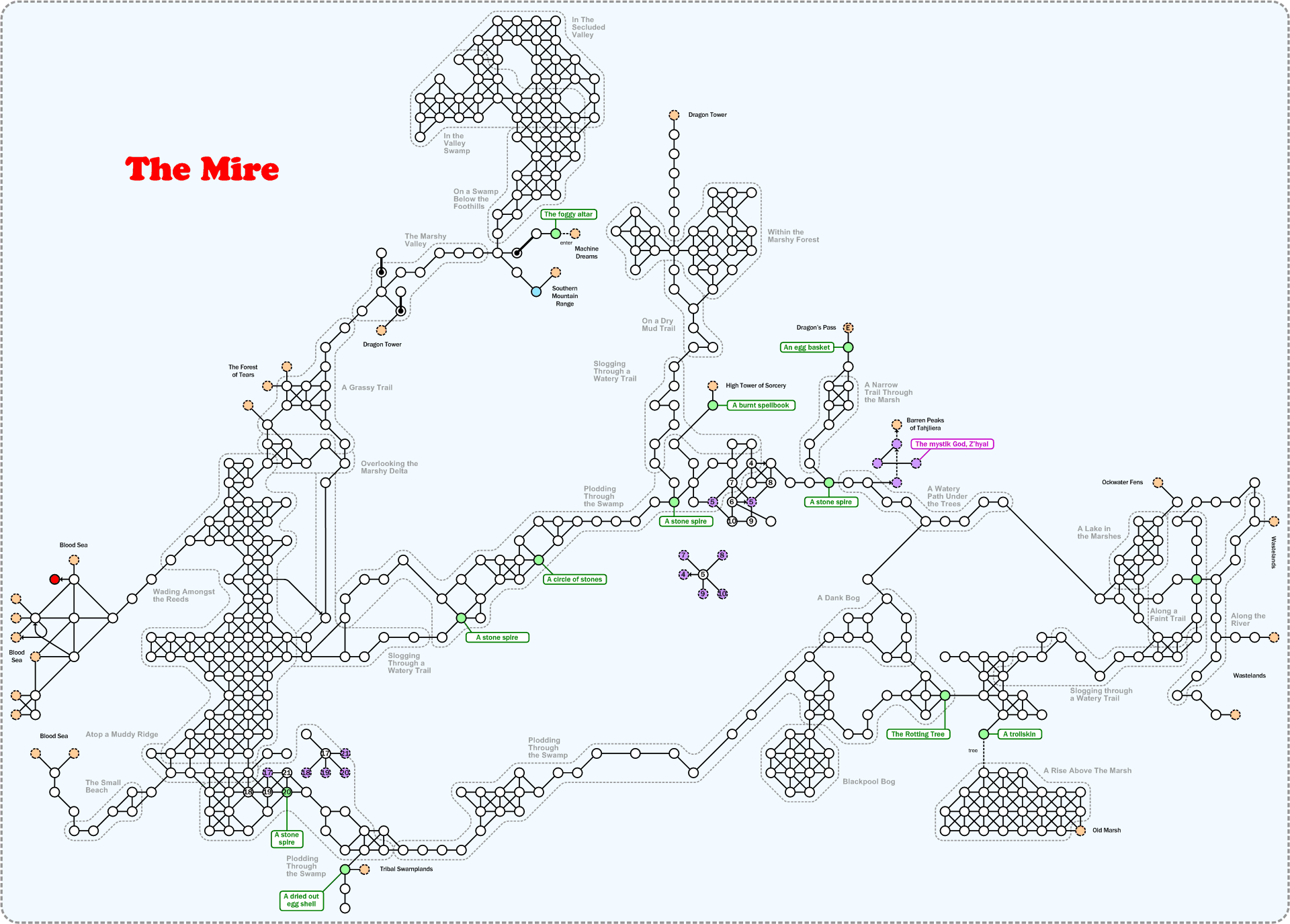Before the Shattering, the Old Marsh was a tiny expanse south of Haon Dor. Little life aside from trolls, lizardmen and bogbeasts thrived there. As the Age of Eskhatos wore on, even that life suffered as it was corrupted and mutated by the toxins from the Tower of Despair. When the Shattering came, the seas spilled over the shore. Debris and offal tumbled down the rising peaks of the Southern Mountains. The water and scum met in the Old Marsh, which expanded and grew as it sat at the mountain base. It encompassed the remnants of Haon Dor which has not been saved by the gods and spilled down to the riverbanks by the Wastes. Those who travel the area no longer call it 'Old Marsh', but 'The Mire' to reflect the cloying and disgusting mass that the southwest edge of the continent has become. Ever changing with the constant flow, The Mire can be quite confusing even to those who think they've seen it all.