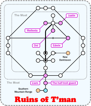 The Ruins of T'man is the hometown of the Half-Troll nation. The starting point (the blue room) is for the non-Half-Troll directions.