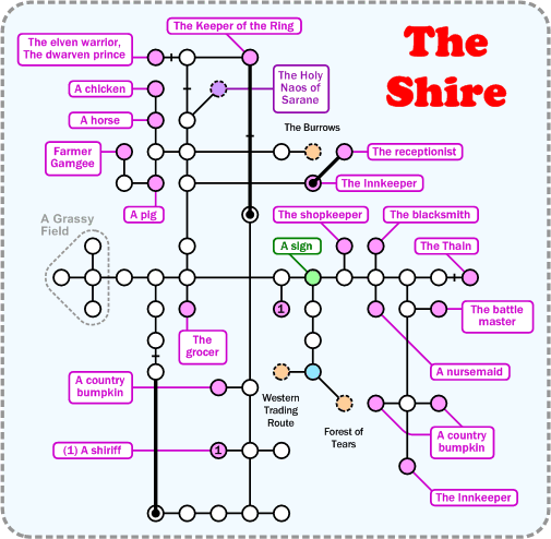 Meandering the Forest of Tears, the Western Trade Route resumes northeast of a crossing of roads amidst this darkened forest. A small direction sign points east to a dimly lit path. The Shire is a small village of halflings and hobbits run by the Thain, who also manages the trade of wheat with other towns. Very little danger exists in the Shire, save for the occasional thieving youth, or angry bull.