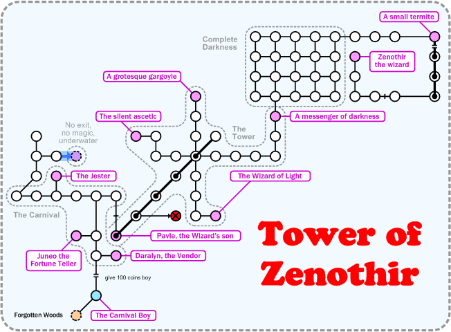 In the Forgotten Woods, to the north of Darkhaven, lies a small village and tall tower. Residing in the tower is, of course, Zenothir, a famed magician who made his fortune with the magical art of illusion and trickery. Other practitioners of this art have flocked to this tower and founded a small village around it, although some say it is more circus than village. Even though it is a well known fact that Zenothir has taken up the cause of Good, these followers firmly believe that those who impress the great mage sufficiently will be rewarded with his infinite knowledge of illusionary magic.