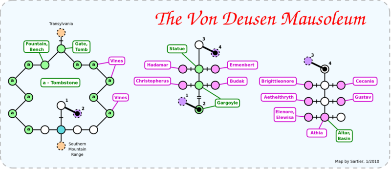 The ancient mausoleum, once a peaceful place of rest, suffers the curse of the blue mist. The power of the magical mists hovers around the mausoleum cloaking it in a shroud of foreboding darkness. High overhead dark clouds circle as they bring forth lightning strikes from within to thrust into the hearts of living beings. The power of the mist sucks at the heart of the very soul, draining the life's force for its dark desires. The building itself is made of cold grey stone dug into the ancient grounds formed by the blood and sweat of those that served the Von Deusens. The family is long since forgotten, save for their cursed remains. It is said that the corpses of the ancient family rise and walk through the paths of the mausoleum and graves.