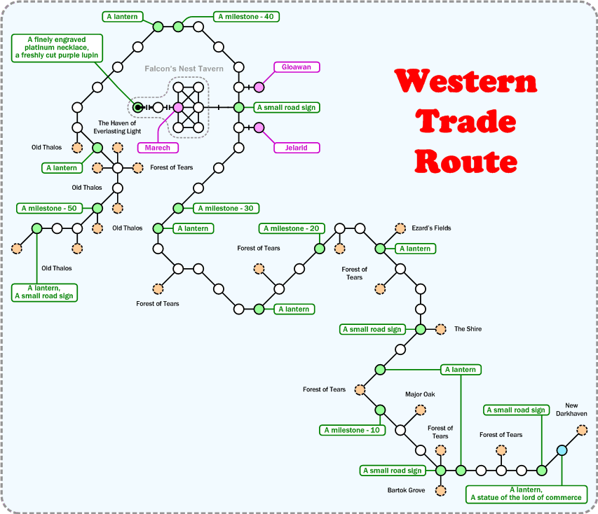 Built as a means to connect the major trading centers of the western half of the Realms, the Western Trade Route was a far sighted project taken on by the merchant societies of Darkhaven. Crossing through much of the Forest of Tears on its way to Thalos, the trade route is said to also go by one of the Realms' most renowned tavern's, the Falcon's Nest, which has become so well known that other merchants have begun to do business nearby. If travelers are looking for a quick and safe route to the commercial centers to the west of Darkhaven, the trade route cannot be beat.